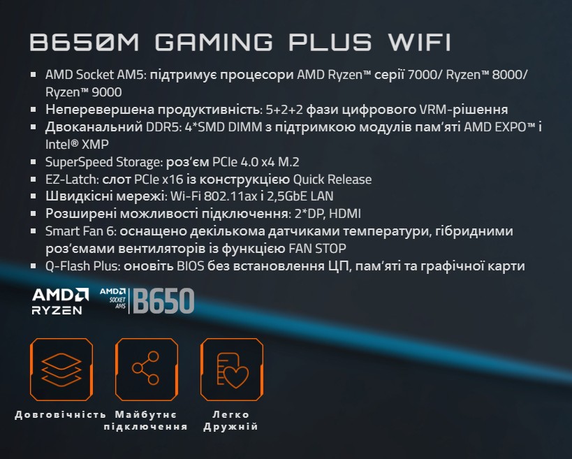 GIGABYTE B650M GAMING PLUS WIFI — оптимальний вибір для тих, хто хоче зібрати сучасну, потужну ігрову або робочу систему з найновішими технологіями. Надійність, швидкість та зручність — усе в одному!