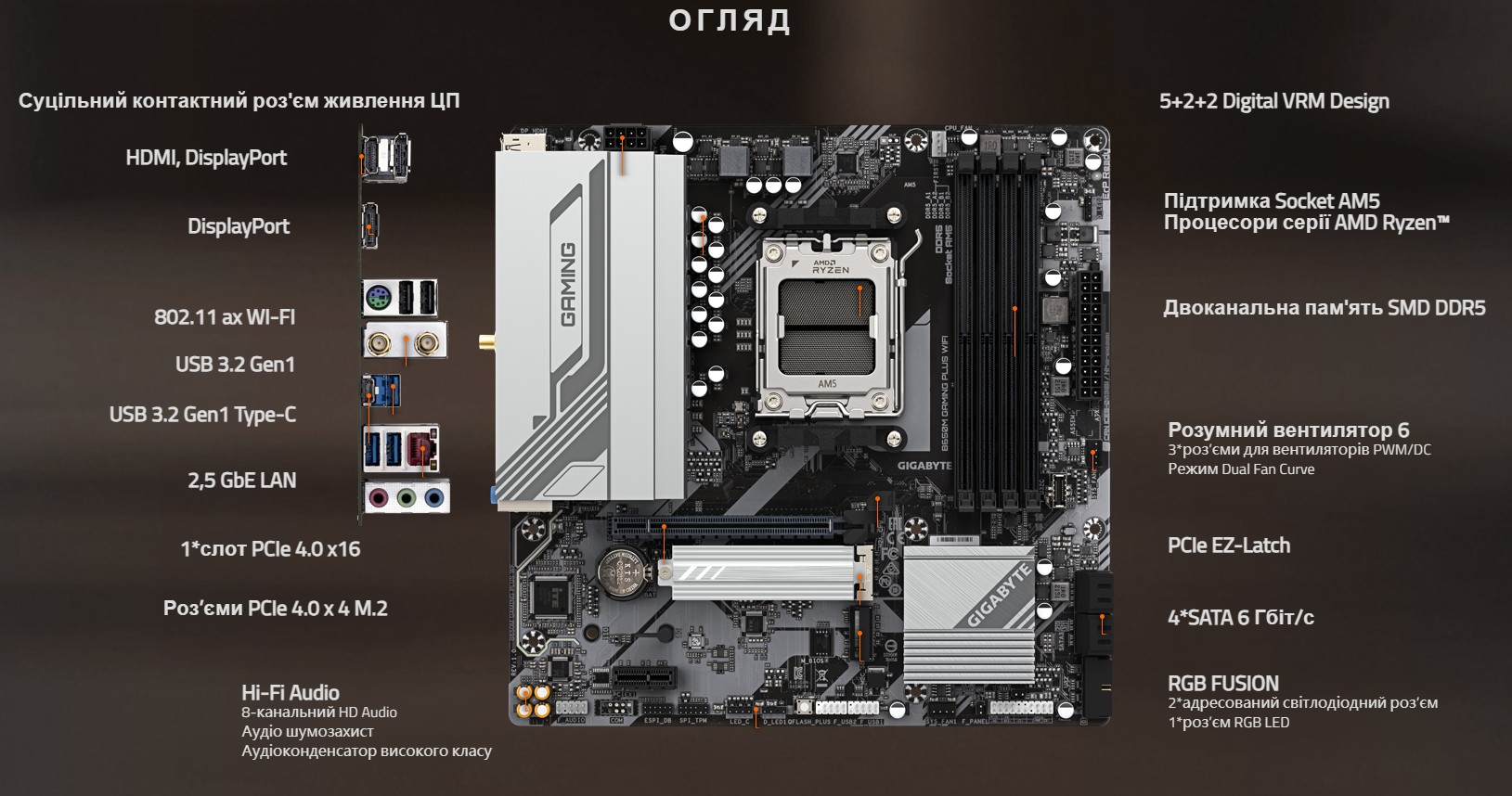 Материнська плата GIGABYTE B650M GAMING PLUS WIFI – ідеальний вибір для геймерів і користувачів, які шукають надійну та сучасну платформу під процесори AMD Ryzen серії 7000.