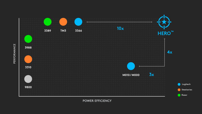HERO використовує інтелектуальну систему керування живленням для безперервного регулювання обробки кадрів залежно від швидкості руху миші. Це дозволяє досягти максимальної продуктивності при мінімальному споживанні енергії. Ресурс роботи батареї становить до 250 годин від однієї батарейки AA.