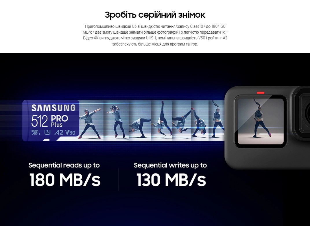 Знімайте більше та швидше. Зробіть ідеальні знімки. Неймовірна швидкість класу зчитування/запису 10, U3 до 180/130 МБ/дозволяє плавно робити та передавати велику кількість фотографій. Швидкість зчитування/запису відео 4К завжди відповідає вимогам класу швидкості UHS-I та V30 для відео. Завдяки класу А2 можна зберігати більше програм та ігор.