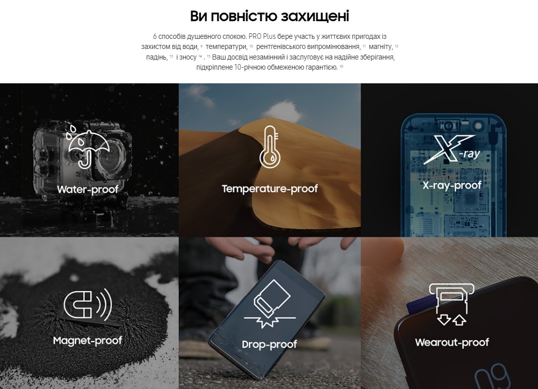 6-рівневий захист для вашого спокою. Карта PRO Plus витримає будь-які пригоди у разі занурення у воду, впливу високих температур, рентгенівського випромінювання, електромагнітного поля та падіння. Крім того, вона захищена від зношування. Ваші неповторні враження заслуговують на надійний вибір. Все це підкріплюється 10-річною обмеженою гарантією.