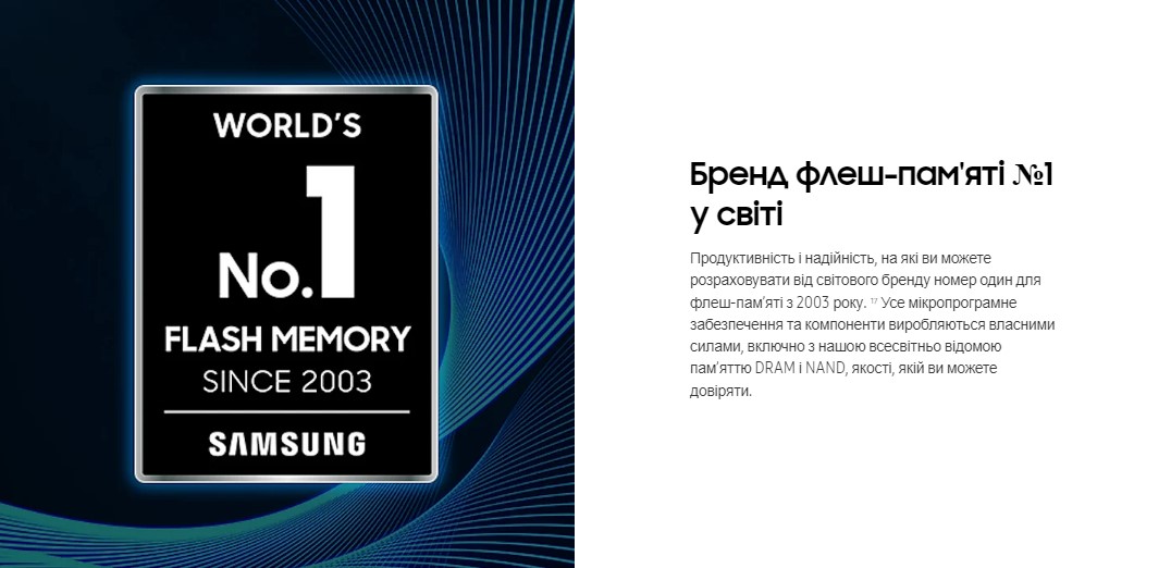 Відкрийте для себе найкращі показники роботи та надійність від кращого з 2003 року у світі бренду флеш-пам’яті. Все вбудоване програмне забезпечення та компоненти, у тому числі відомі у світі DRAM та NAND від Samsung, розробляються самою компанією. Отже, забезпечується комплексна інтеграція та якість, якій ви можете довіряти.