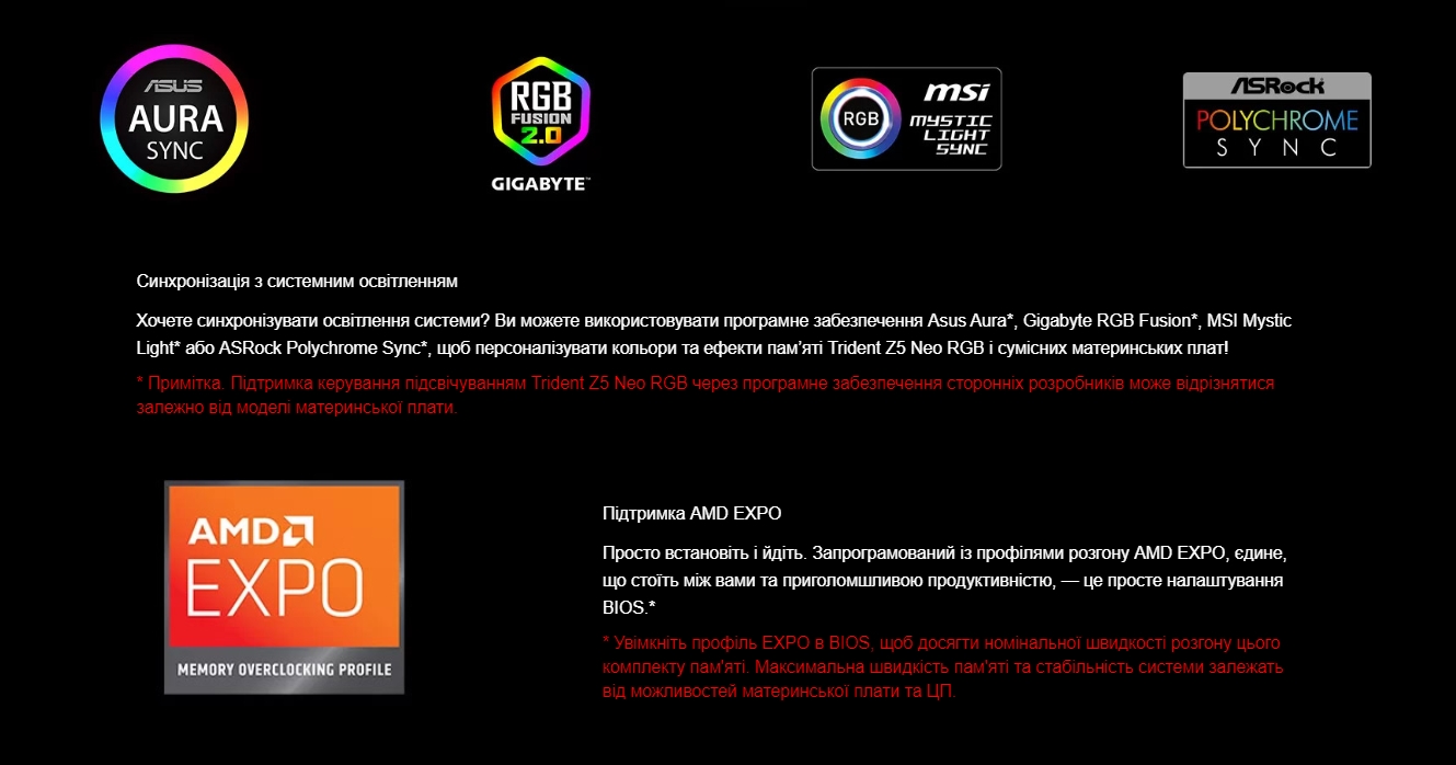 - Додаткові опції RGB підсвічування, Серія для розгону (AMD EXPO)
