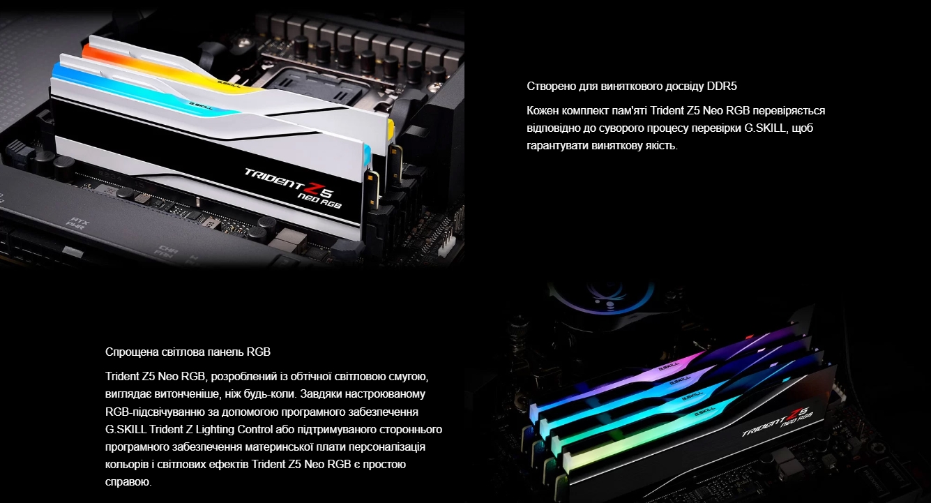 Пам’ять DDR5 серії Trident Z5 NEO RGB – це найновіші флагманські комплекти пам’яті G.SKILL, призначені для надвисокої екстремальної продуктивності на платформах нового покоління DDR5. Завдяки більш гладкій та обтічній конструкції алюмінієвого радіатора, доступного в сріблястому металевому або чорному матовому кольорі, пам’ять Trident Z5 RGB NEO серії DDR5 є ідеальним вибором для геймерів, оверклокерів, творців контенту та ентузіастів для побудови високопродуктивних систем.