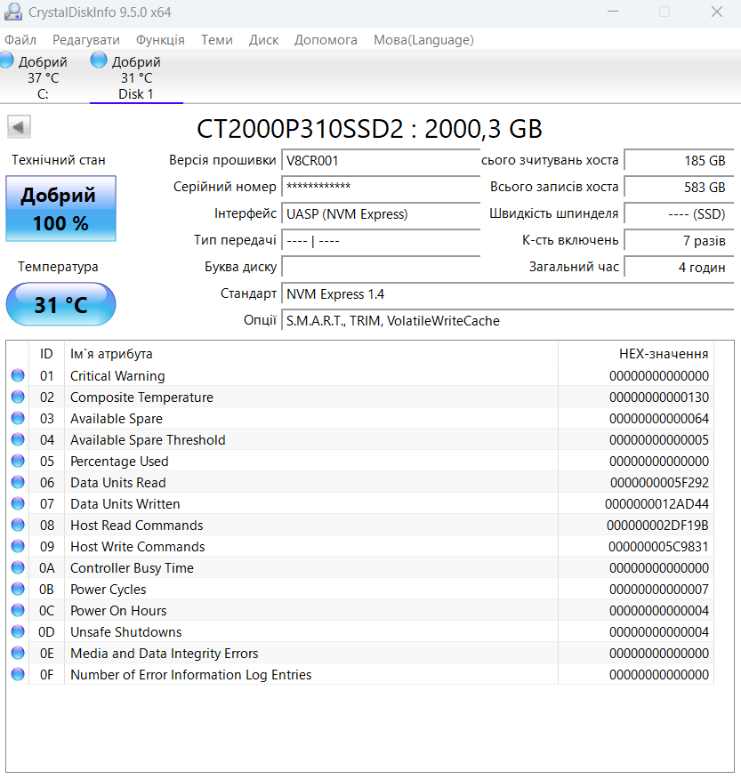 У галереї товару додано актуальний скріншот з CrystalDiskInfo з інформацією про стан накопичувача.