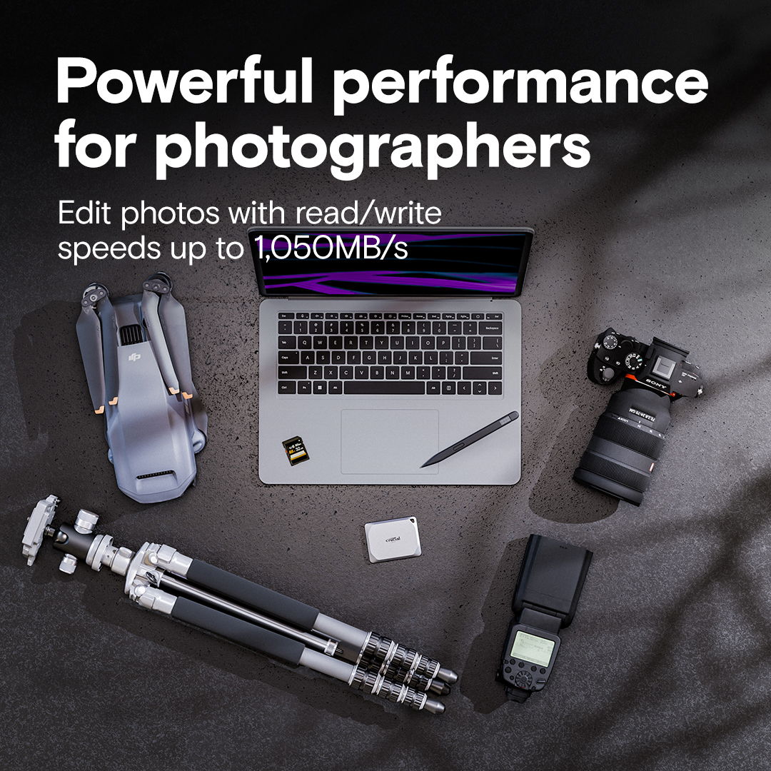 Прискорте робочий процес із потужним зовнішнім накопичувачем Crucial X9 Pro 4 TB. Завдяки високим швидкостям зчитування та запису до 1050 МБ/с, він ідеально підходить для фотографів, відеографів та креативних професіоналів.