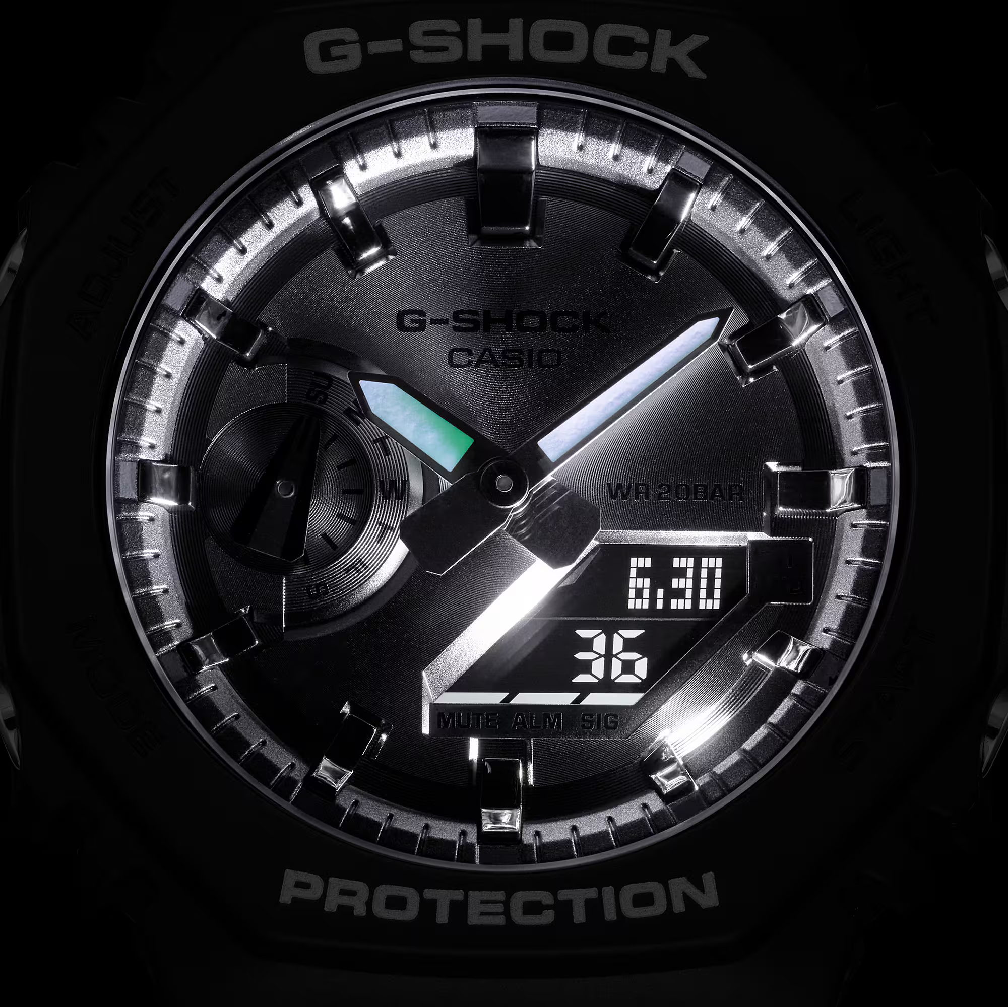Casio G-Shock GA-2100SB-1ACR поєднує легендарний дизайн першого G-SHOCK з сучасними металевими акцентами. Його культова восьмикутна форма, натхненна оригінальною моделлю DW-5000C, отримала витончений металевий блиск і неймовірно тонкий корпус завтовшки лише 11,8 мм.