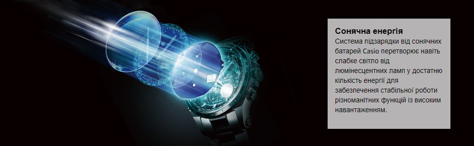 - Дод. функції: світлодіодне підсвічування, багатодіапазонний шестиатомний час, світовий час, щоденний будильник із відстрочкою, 12- та 24-годинний формати часу, сонячна батарея, стійкість до ударів та падіння, водонепроникність, саморегаляція часу.