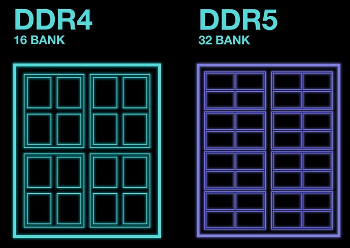 DDR5 має до 32 банків пам’яті (комірки для зберігання даних), об’єднаних у 8 груп, що вдвічі перевищує можливості DDR4 з її 16 банками. Також збільшено довжину передачі даних (burst length), що забезпечує швидший доступ до інформації.