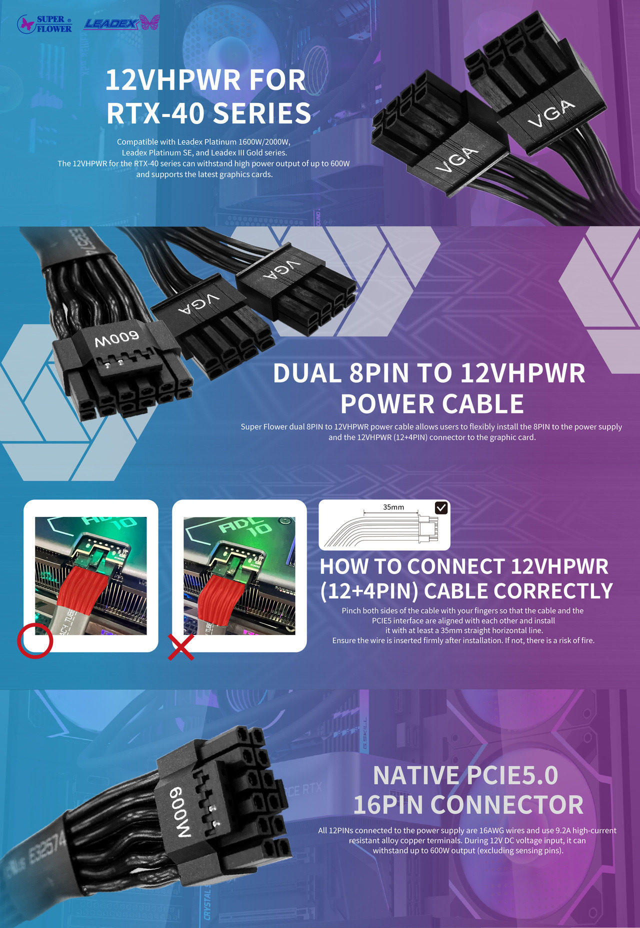 - Підключаючи рідні кабелі з подвійним 8-контактним / 9-контактним PCI-e до 12VHPWR, будь ласка, переконайтеся, що вони повністю підключені. Якщо він не підключений надійно, він може загорітися.