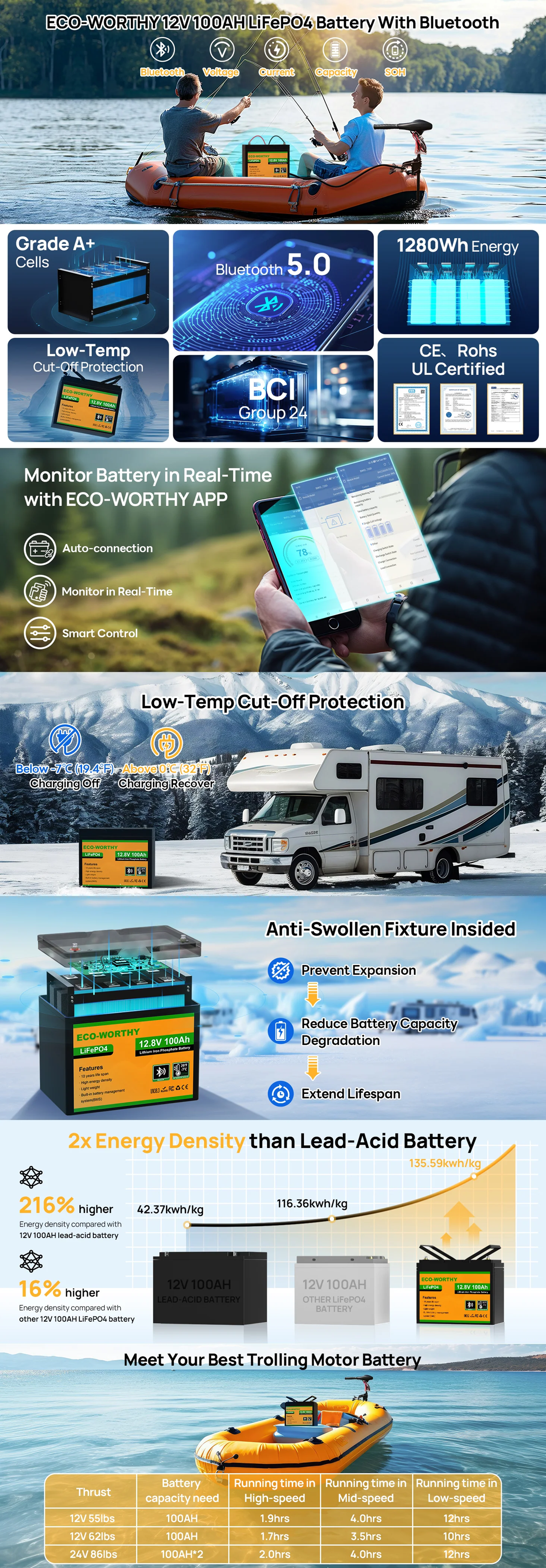 Оновлений акумулятор ECO-WORTHY 12V 100Ah LiFePO4 оснащений модулем Bluetooth 5.0, що дозволяє відстежувати напругу, струм і ємність батареї прямо з вашого смартфона. Ви також зможете контролювати залишковий термін служби акумулятора та уникати непередбачених ситуацій, зокрема під час риболовлі чи подорожей.