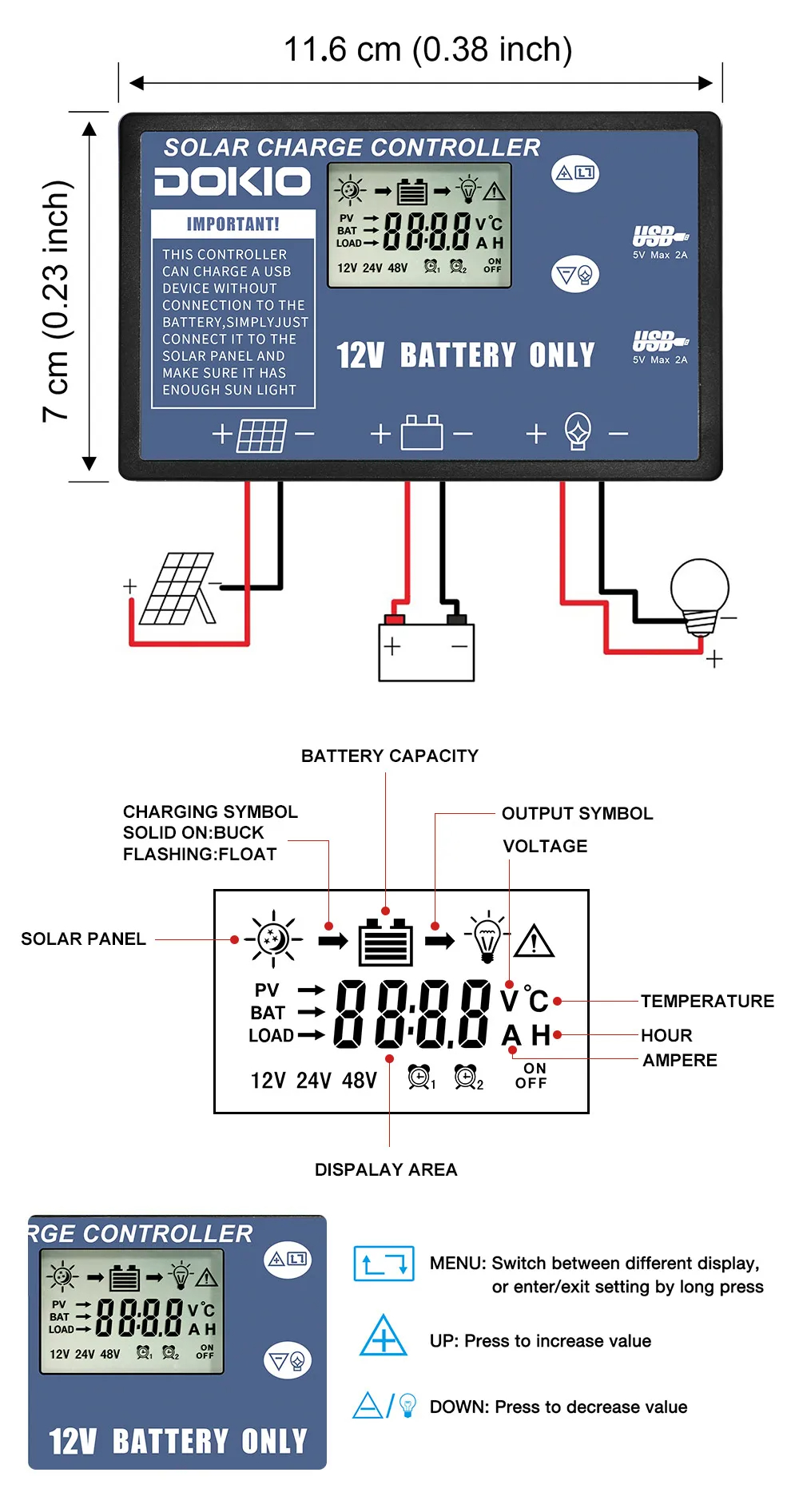 Сонячний контролер (є в комплекті) має 2 виходи USB 2A для зарядки будь-яких гаджетів, стабілізований вихід 12В і вихідні клеми з “крокодилами” для заряду акумулятора.