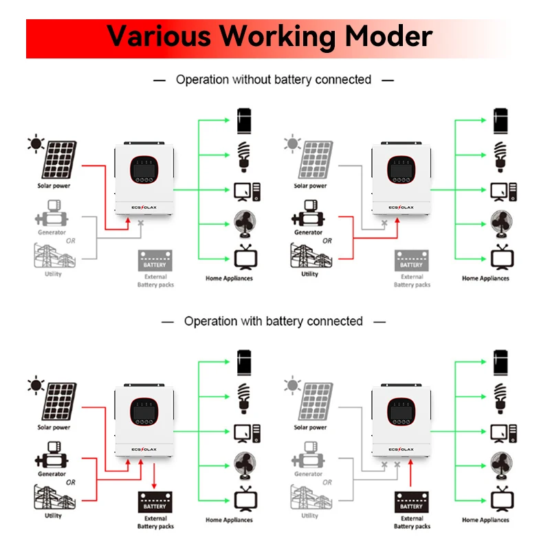 ECGSOLAX Hybrid Solar Inverter — це багатофункціональний гібридний інвертор нового покоління, який поєднує в одному корпусі чистосинусний інвертор, MPPT-контролер заряду, UPS-модуль та інтелектуальну систему керування. Ідеальне рішення для автономних та гібридних сонячних електростанцій, систем резервного живлення та власного енергоспоживання.