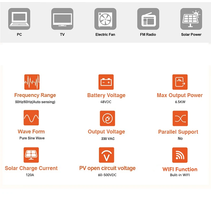 Інвертор може працювати як з акумуляторами, так і без них, використовуючи енергію сонця та електромережі одночасно. Вбудований Wi-Fi-модуль дозволяє дистанційно контролювати роботу системи через смартфон або веб-інтерфейс у режимі реального часу.