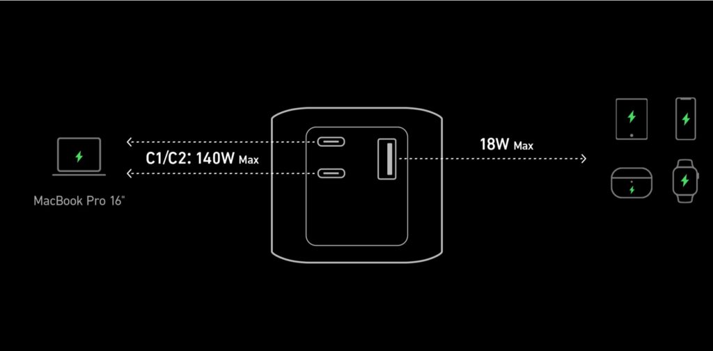 Акумулятор має 2 USB-C порти та 1 USB-A порт, що дозволяє заряджати одночасно телефон, планшет та ноутбук. Підключення одного пристрою до порту USB-C забезпечує потужність до 140 Вт.