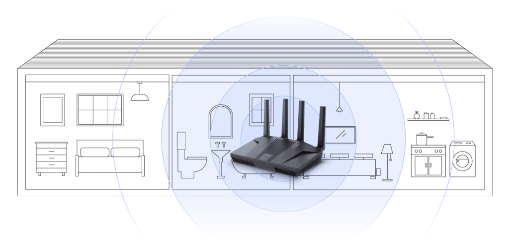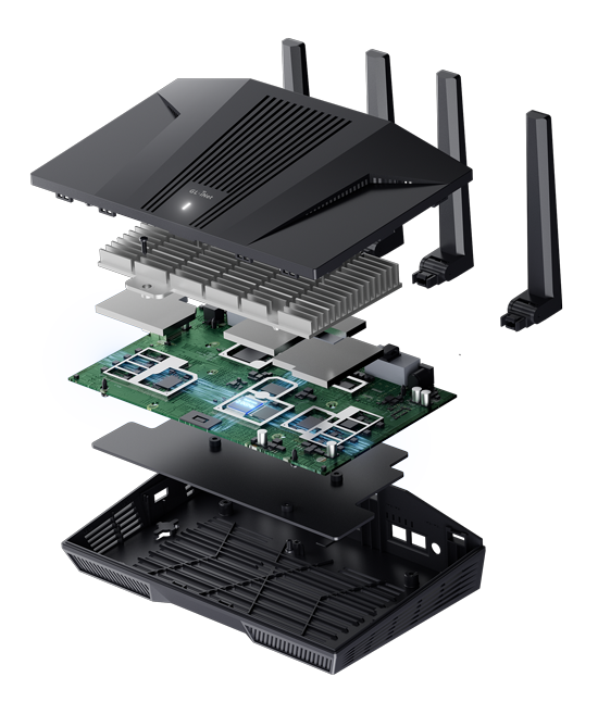 8 високопотужних FEM-модулів та чотири комбіновані антени (2,4 + 5 ГГц) забезпечують стабільний сигнал навіть у середніх за площею будинках.