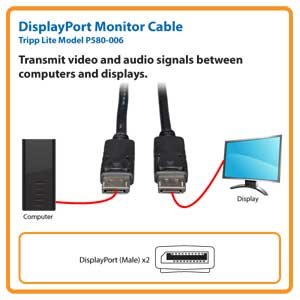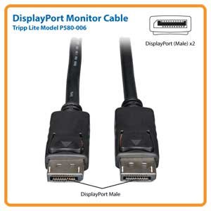 Кабель Tripp Lite P580-006 6 футів DisplayPort (M/M) ідеально підходить для цифрових вивісок, відеопрезентацій, дисплеїв у торгових точках, навчальних класах та інших програм, які відображають відео високої роздільної здатності та багатоканальний звук. Він з’єднує комп’ютери та ноутбуки з роз’ємом DisplayPort з дисплеями з роз’ємом DisplayPort, такими як монітори, проектори та телевізори високої чіткості. Цей кабель підтримує відео надвисокої чіткості (UHD) з роздільною здатністю 4K x 2K до 3840 x 2160 (60 Гц), швидкість передачі даних до 10,8 Гбіт/с, HDCP, DPCP і DisplayPort v1.2.
