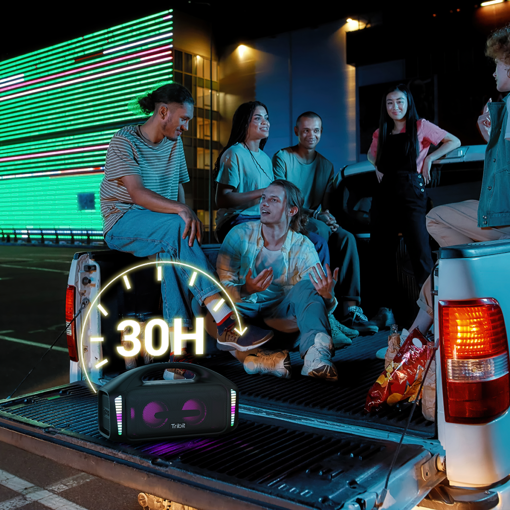 Завдяки технології Runstretch від Tribit, StormBox Blast забезпечує 30 годин динамічного звучання. Будь то вечірка, сімейне барбекю або похід – день чи ніч може стати вечіркою з Tribit StormBox Blast.